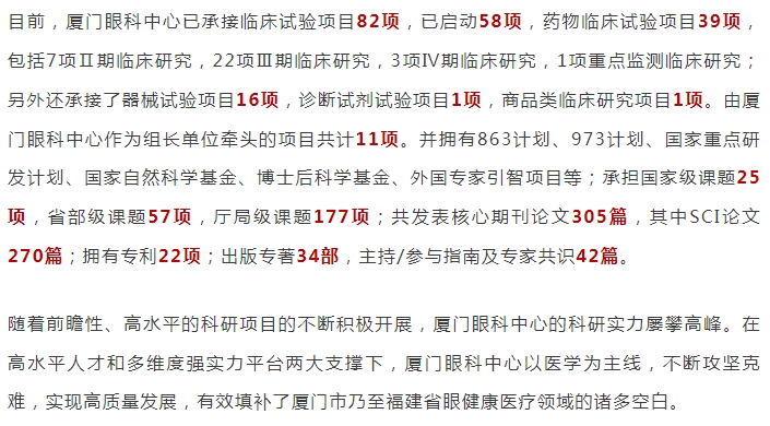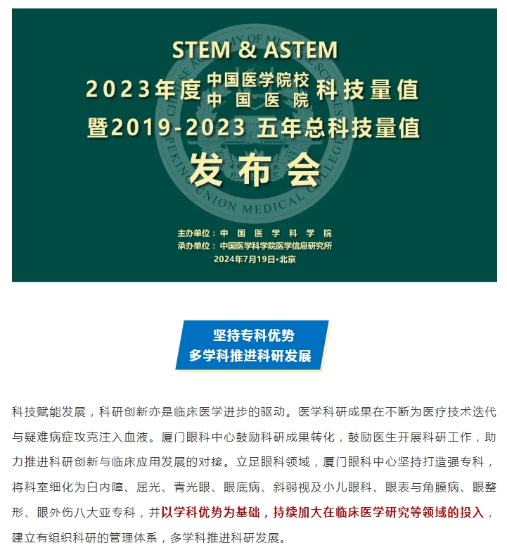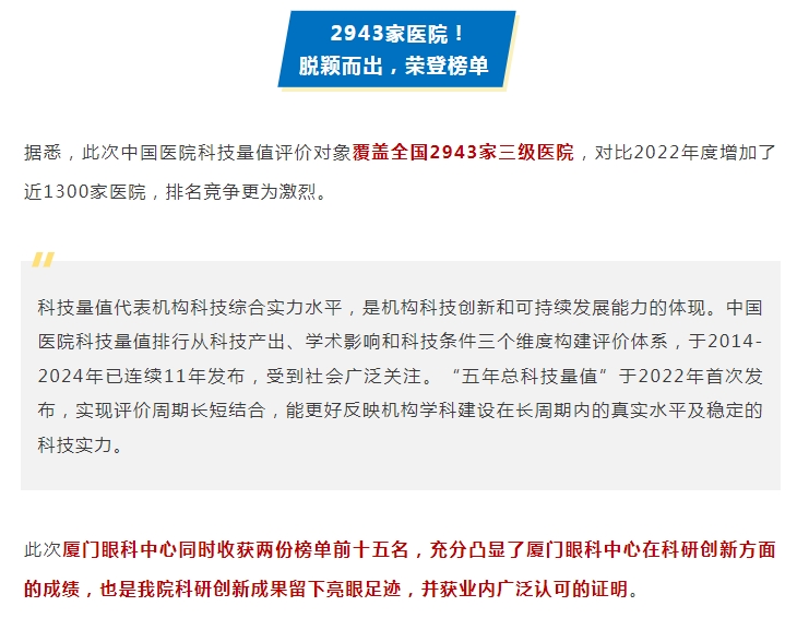 厦门眼科中心在中国医院科技量值排行榜(眼科学)中荣登第15位,五年总科技量值排行榜中位列第14位