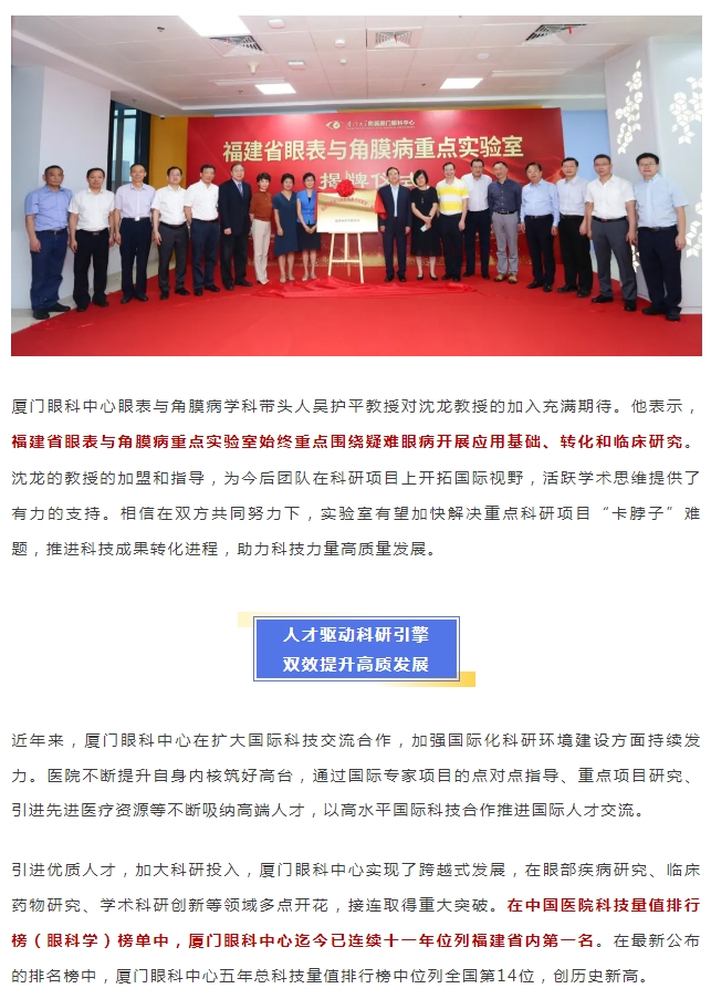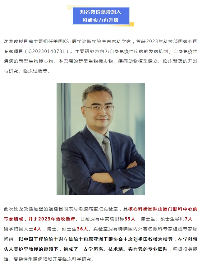 再添专家!厦门眼科中心聘请沈龙教授为福建省眼表与角膜病重点实验室客座教授