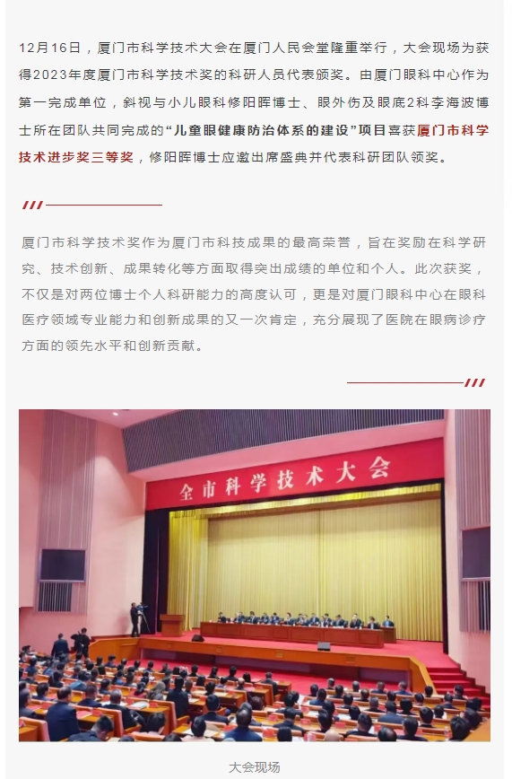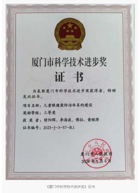 祝贺!厦门眼科中心修阳晖博士、李海波博士喜获2023年厦门市科学技术进步奖三等奖