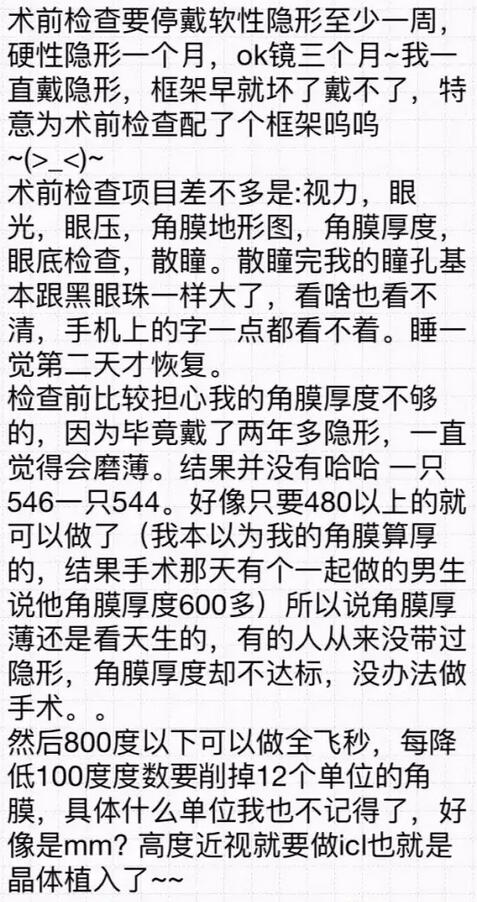 你好!我是2016年12月18日在和平眼科做过全飞秒的患者~现在已经摘掉眼镜了,特别开心!附件有一个我写的分享,一共是7页图片,希望能给其他还没做或者犹豫做手术的朋友们带来帮助。写了好几晚,终于写完了~