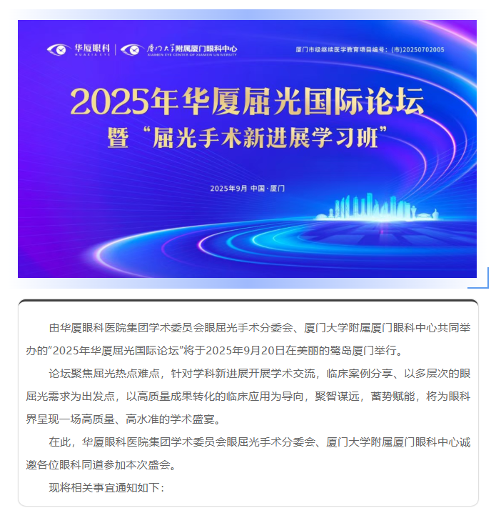 【日程上线】2025年金沙9001以诚为本屈光国际论坛——暨厦门市级继续医学教育项目“屈光手术新进展学习班”