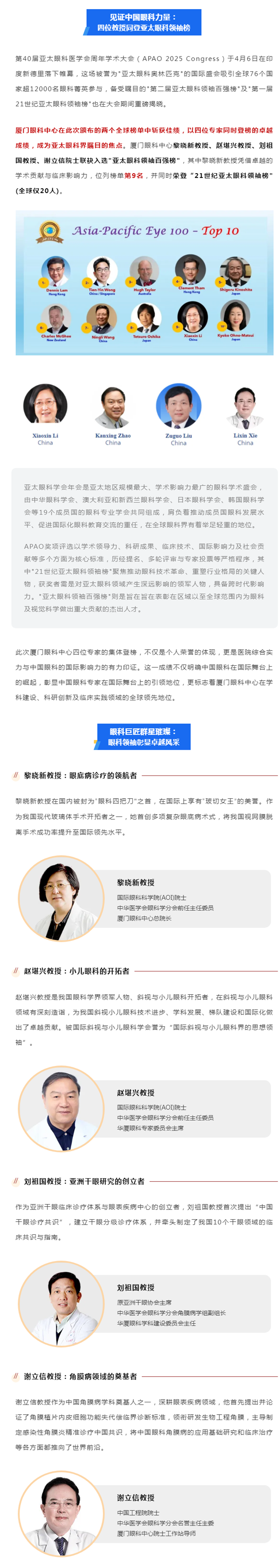 亚太眼科领袖榜发布,厦门眼科中心黎晓新总院长跻身全球前二十!