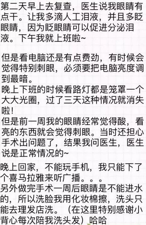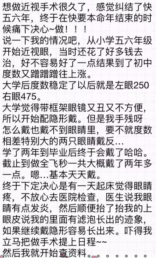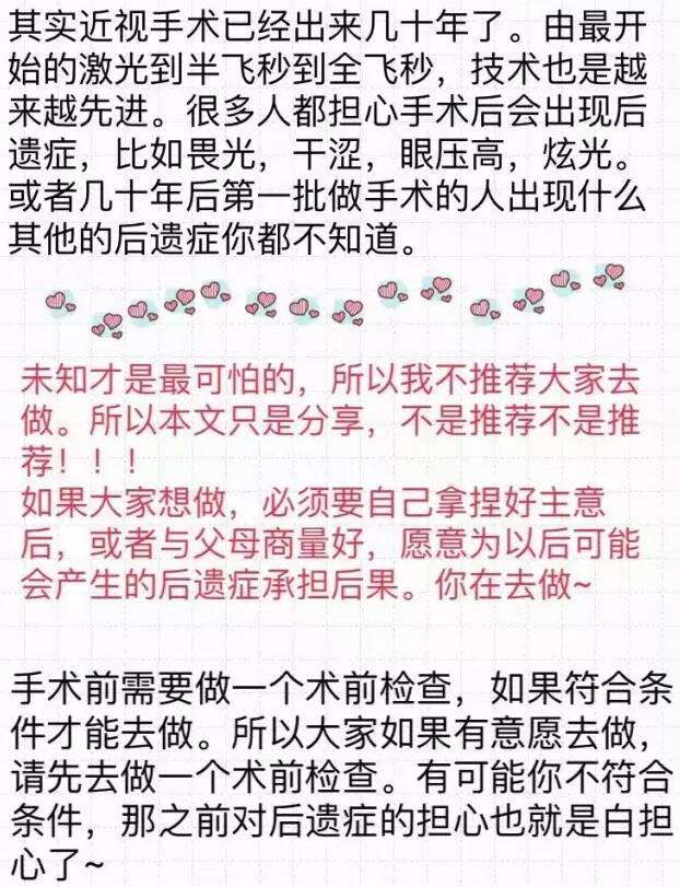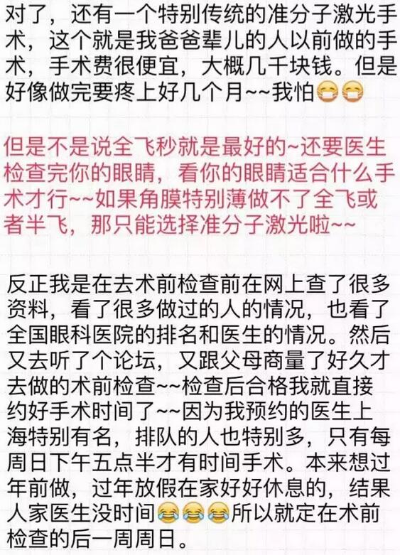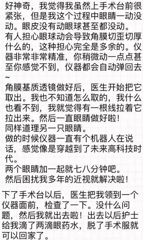 【导读】你好!我是2016年12月18日在和平眼科做过全飞秒的患者~现在已经摘掉眼镜了,特别开心!附件有一个我写的分享,一共是7页图片,希望能给其他还没做或者犹豫做手术的朋友们带来帮助。写了好几晚,终于写完了~
